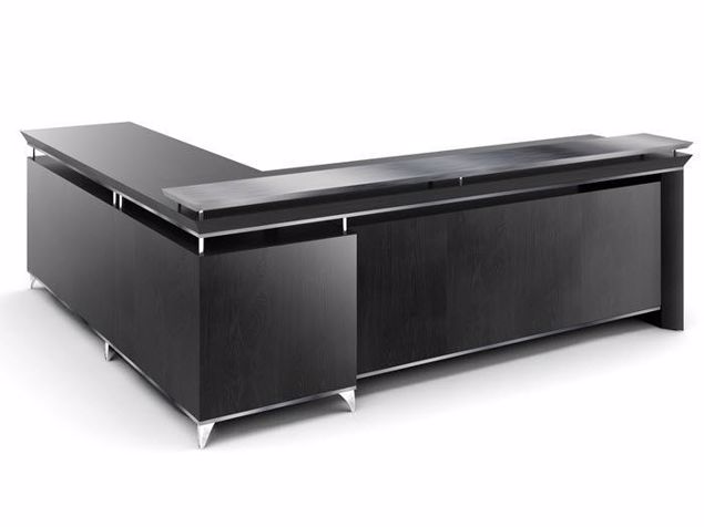 Peoria Desk showcases sleek stainless steel legs and glass standoffs, offering a blend of industrial strength and polished aesthetics for a commanding executive presence.