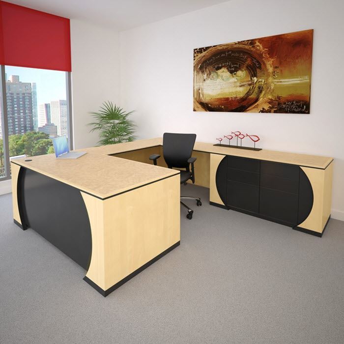 Zambano Modern Executive Desk, Blonde maple wood with sleek circular black laminate cut-outs, epitomizing sophistication and contemporary design.