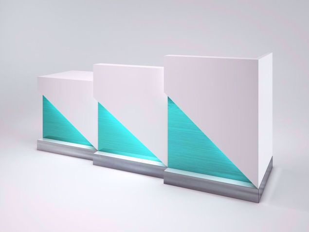 Calabria Reception Desk features a fresh geometric design with teal aluminum accents, LED backlight- framed in a sleek, minimalist profile for a modern and vibrant first impression.