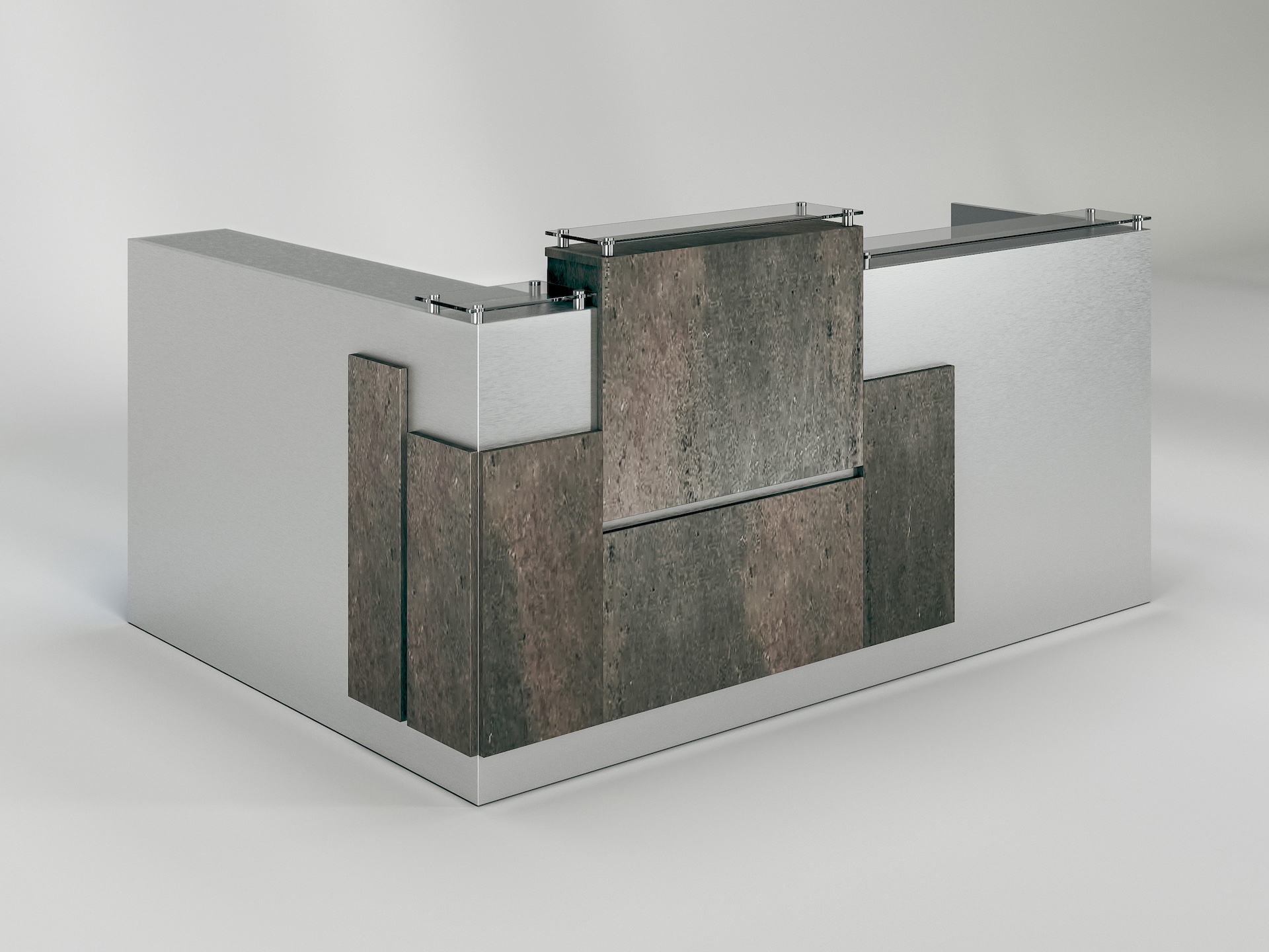 The Dallas desk combines the natural beauty of wood veneer with the modernity of glass transaction tops, accented by sleek aluminum stand-offs for a design that’s both elegant and practical.