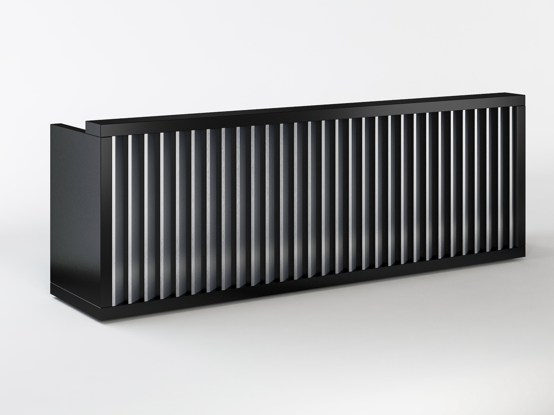 The Greenwich Modern Reception Desk exudes sleek sophistication with its black high gloss laminate, while the angled metal slats add a dynamic, architectural element to its contemporary design.
