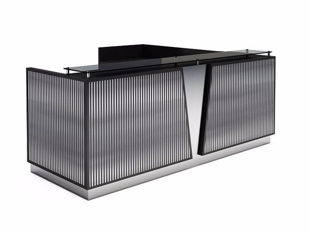 Sleek, modern reception desk with stainless steel flair and a chic black finish, crowned with a clear glass top for a refined, engaging entry statement.