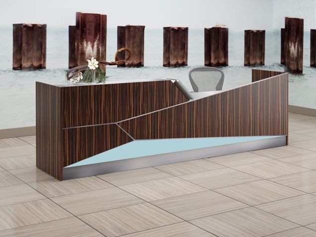 The Manhasset Reception Desk features a warm wood grain finish accented by modern, minimalist lines and a subtle pop of color, perfect for creating an inviting yet stylish first point of contact in any corporate or retail environment.