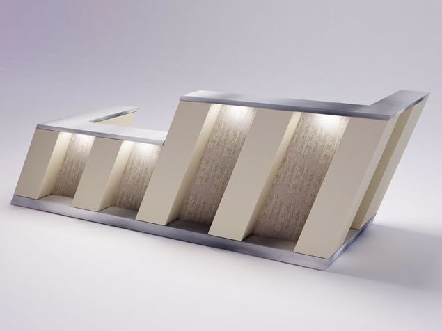 The Plano reception desk showcases a blend of silver and wooden tones in a sleek, horizontal pattern. The alternating panels create a rhythmic aesthetic, marrying the warmth of wood with the modernity of metal accents, ideal for a contemporary office welcoming area.