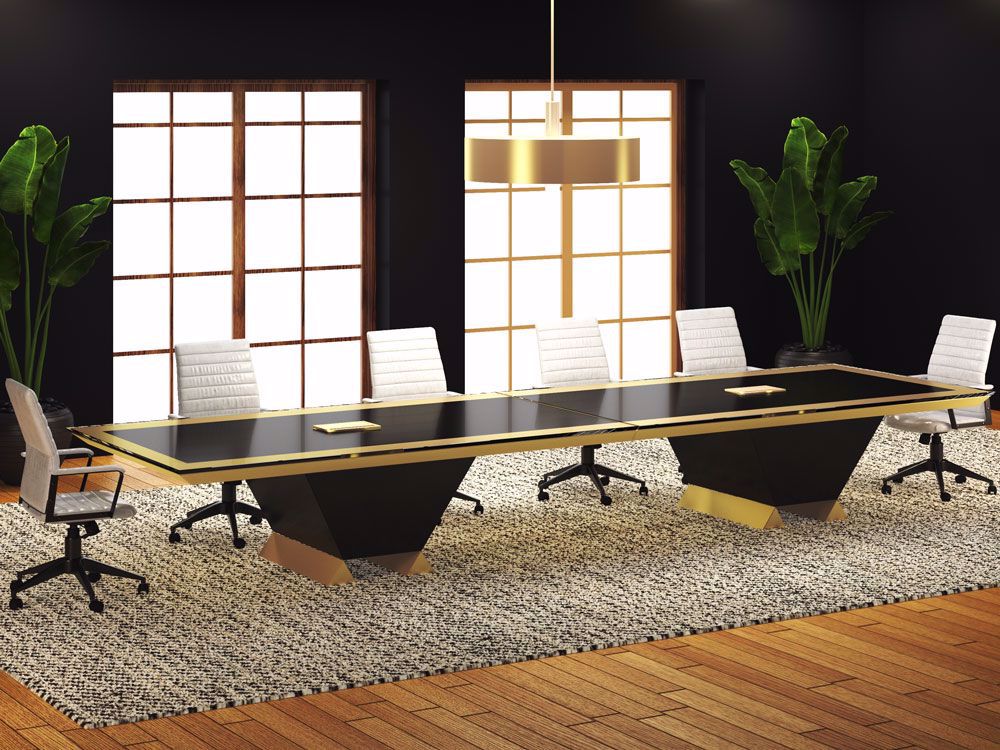 The Brussels conference table is a testament to luxury, featuring a sleek black surface with golden accents, perfect for meetings that require a touch of opulence in a modern setting.