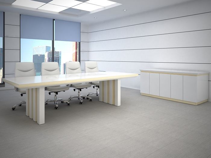 The Carolina table, with its tranquil stone top and sturdy columnar legs, infuses meeting spaces with a sense of calm authority, perfect for strategic discussions in a modern, sophisticated setting.