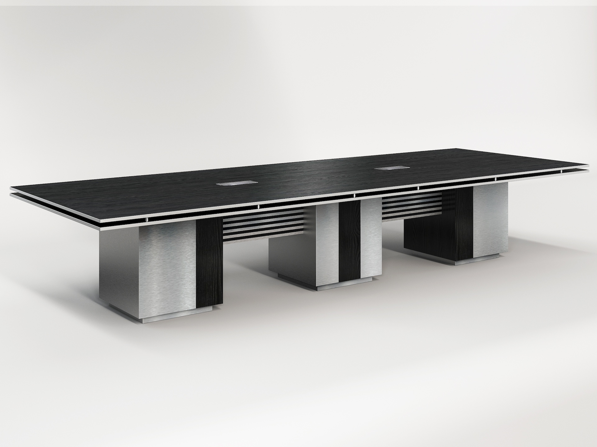 The Chandler table’s sleek design features a stainless steel bridge and a minimalist grey palette, perfect for modern conference rooms focused on clean aesthetics and sharp lines.