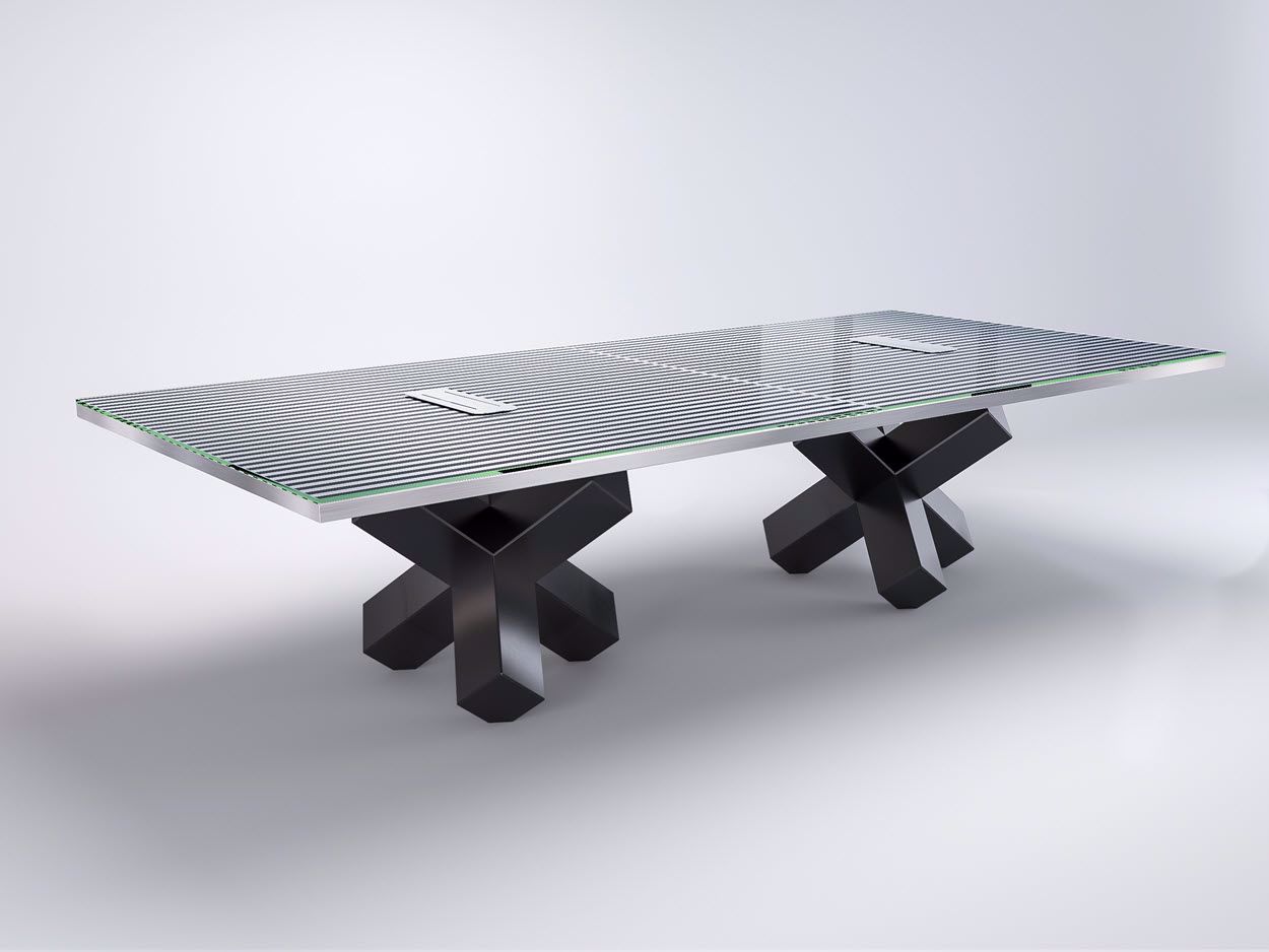 The Lima conference table captivates with its distinctive cross-base design and wood grain surface, offering a bold yet elegant centerpiece for high-stakes discussions.