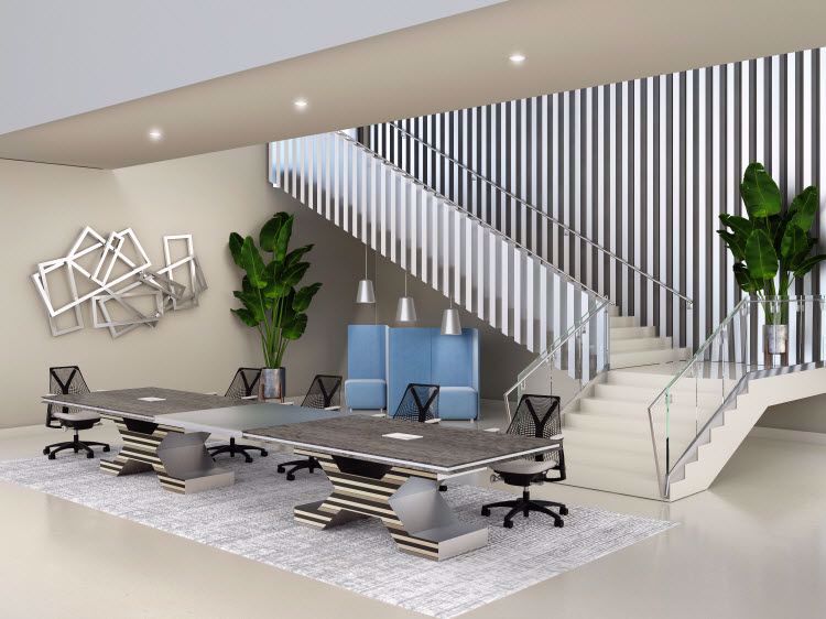 The Moreno conference table showcases a striking contrast with its dark wood finish and central glass insert, supported by an industrial-chic base—a modern marvel for collaborative spaces.