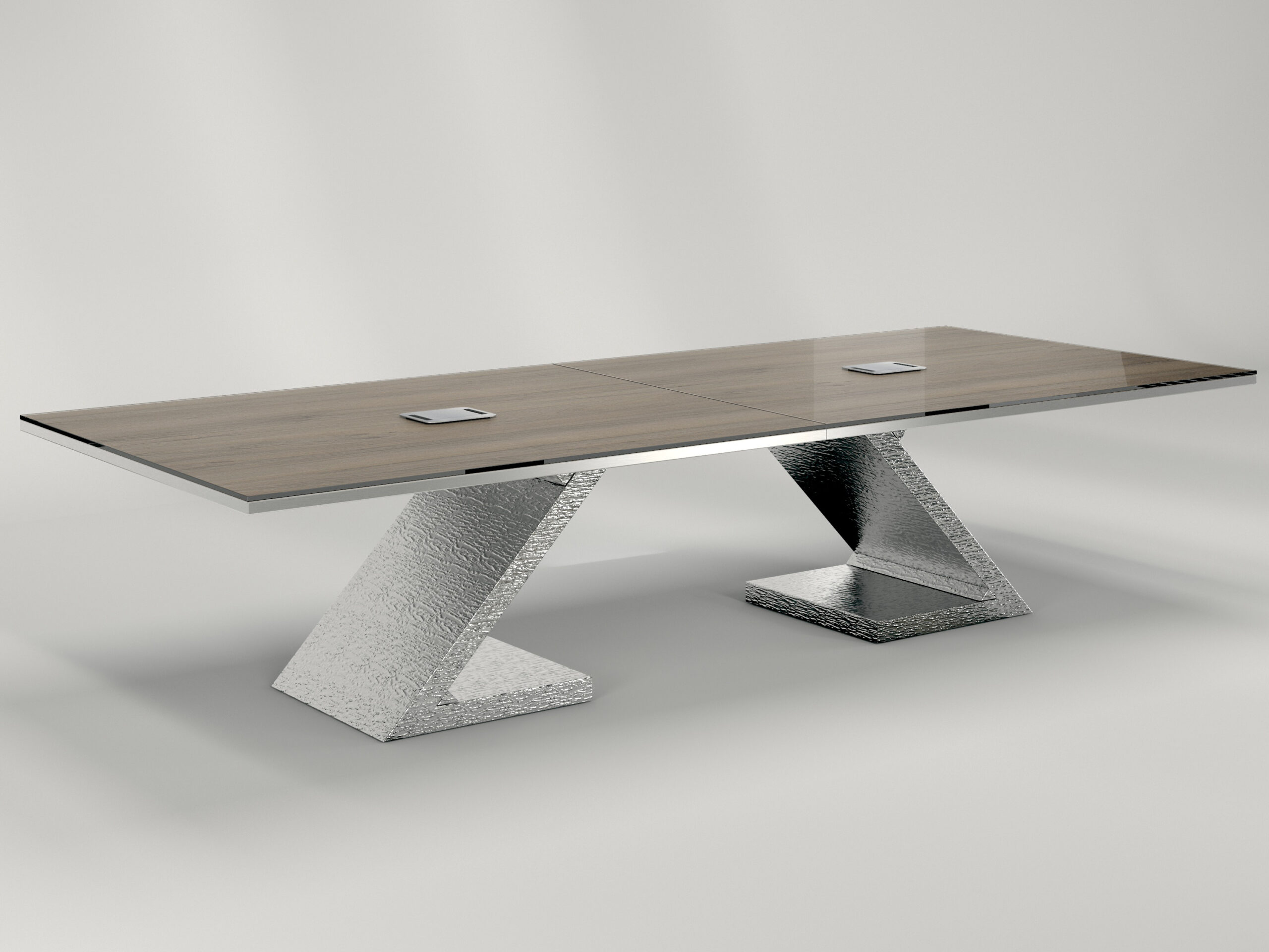 The Sydney conference table harmonizes a glass top with a stainless steel ‘z’ shaped base and wood veneer detailing, offering a sleek, contemporary setting for executive decision-making.
